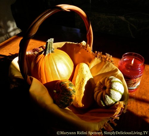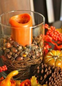 The gorgeous oranges, yellows, greens, golds, reds found in nature create beautiful fall and holiday tables. So bring the outdoors in! Create inviting autumn centerpieces, decorative mantles and harvest room décor with colorful autumn vegetables, acorns, pine cones, leaves, and other items found outdoors. You might want to fill a wooden basket with autumn vegetables (like the one pictured above), or add in a cinnamon or pine scented candle to create the perfect ambiance.