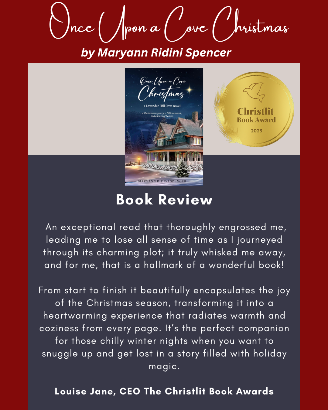 “Maryann Ridini Spencer weaves a Christmas holiday tale of love, rivalry, human errors, and reconciliation set against the backdrop of the small village of Lavender Hill Cove. Romantic competitors, juvenile offenders, and village leaders come together to rise above their flaws, awakening to a deeper understanding of the essence of Christmas in their community. There is a message in her words to be cherished by her readers.” ~Father Gregory Elder, Ph.D., Pastor, Sacred Heart Church, Palm Desert, CA “Lavender Hill Cove, a New England village, is decorated in holiday splendor, and Ella Martin is captivated by the magic of this most wonderful season of the year. But everyone doesn’t feel the magic or understand it. Vandals are destroying holiday scenes. But who? And why? So, the mystery begins, and as it unfolds, recently widowed Ella unexpectedly discovers she can fall in love again. Once Upon a Cove Christmas is a beautiful holiday story of love, redemption, and second chances. You’ll tell your friends about this one!” ~Joanne Hardy, author, The Girl in the Butternut Dress, Random Truths, and ABANDONED