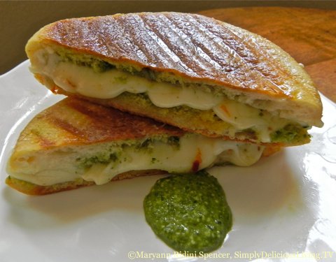 I first had a panini, and Italian sandwich, when I visited Milan a number of years ago working at a film festival. Panini’s are made with anything other than sliced bread (such as ciabatta, rosetta and baguette). Here’s one I make using my panini press (a Cuisinart Griller), that is sure to become a family favorite. When I make this recipe, I always have left over pesto that I serve with pasta the next day!