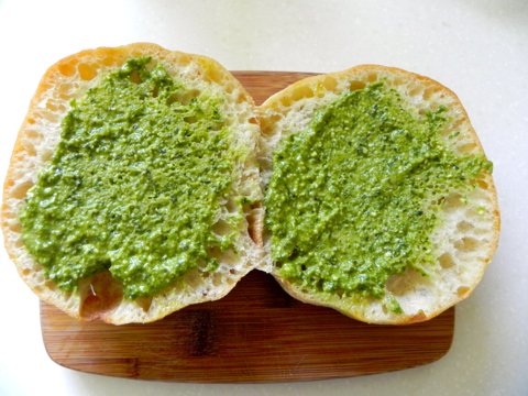 - Place a dollop of pesto on both sides of the sandwich and spread.