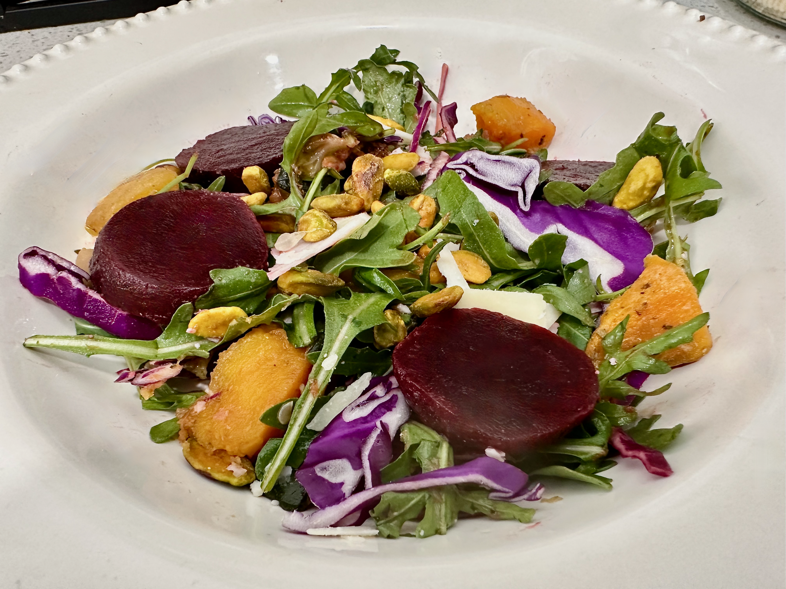 - Top veggies with arugula and red cabbage.