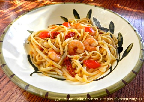 You can make this dish in under 20 minutes! It’s so tasty! The red pepper flakes (depending upon how “hot” you like your food), adds a little kick to this pasta. For a Complete Meal Idea, Serve this dish with my Simple Side Salad.