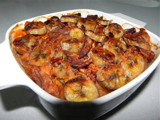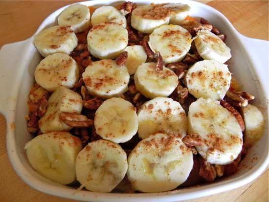 - Repeat all layers – potatoes, bananas, pineapple, spices and pecan pieces. Sprinkle a little more pumpkin spice on top. If you like, you can also sprinkle a little brown sugar over the top.