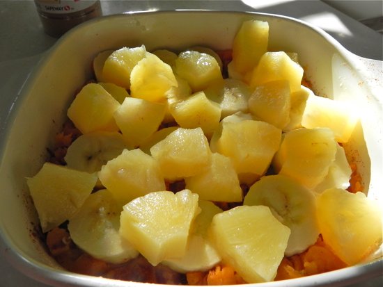 - One: Put a layer of cooked sweet potatoes on the bottom of the Pyrex dish and top with sliced bananas and pineapples. Top with spices and pecan pieces.
