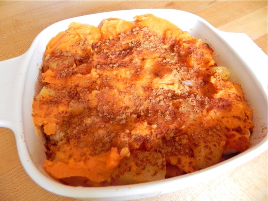 - In a pyrex baking dish, line bottom of the pan with cooked sweet potatoes.