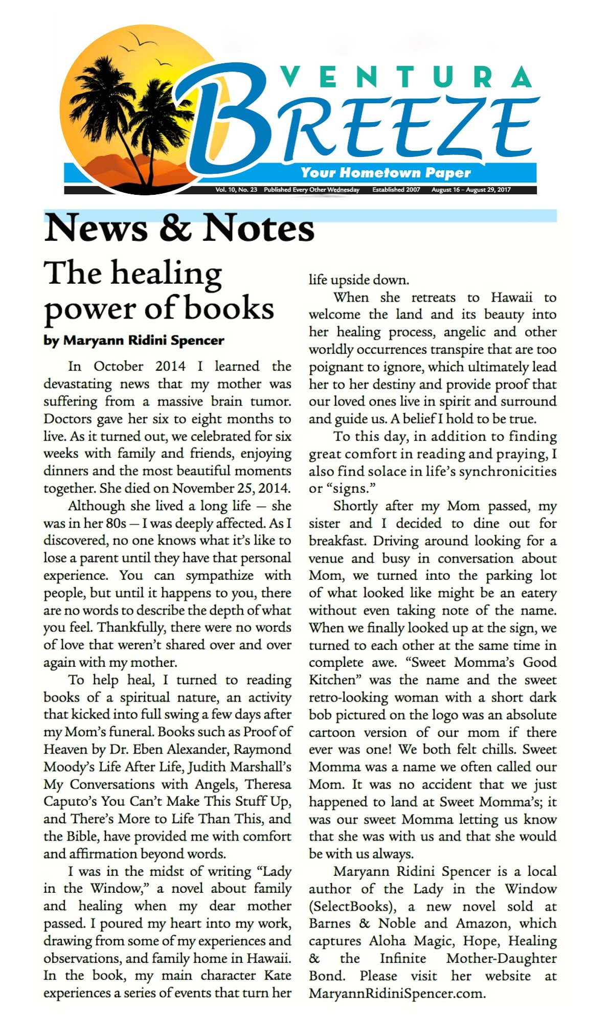 “The Healing Power of Books” Lady in the Window Article in Ventura Breeze